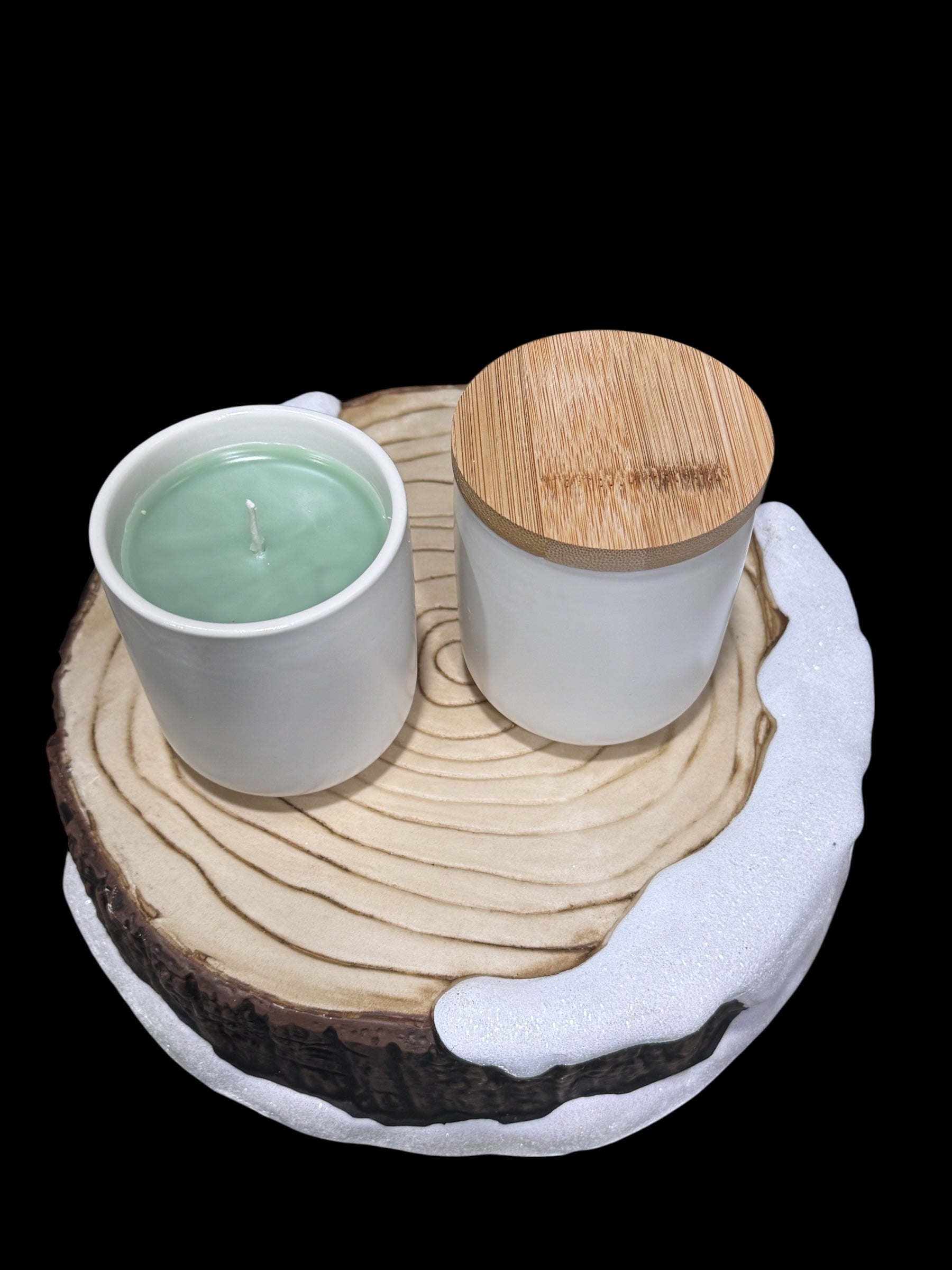- Vessel: White Ceramic Jar with Wood Top